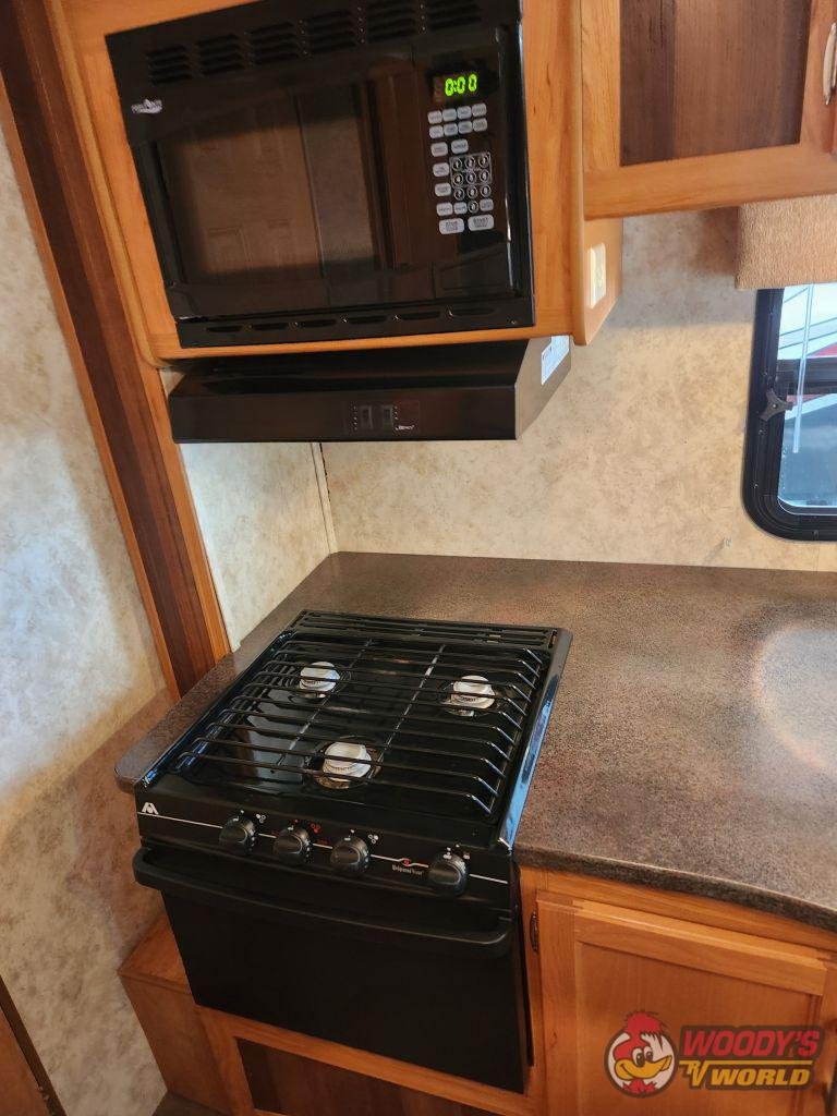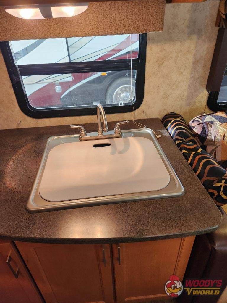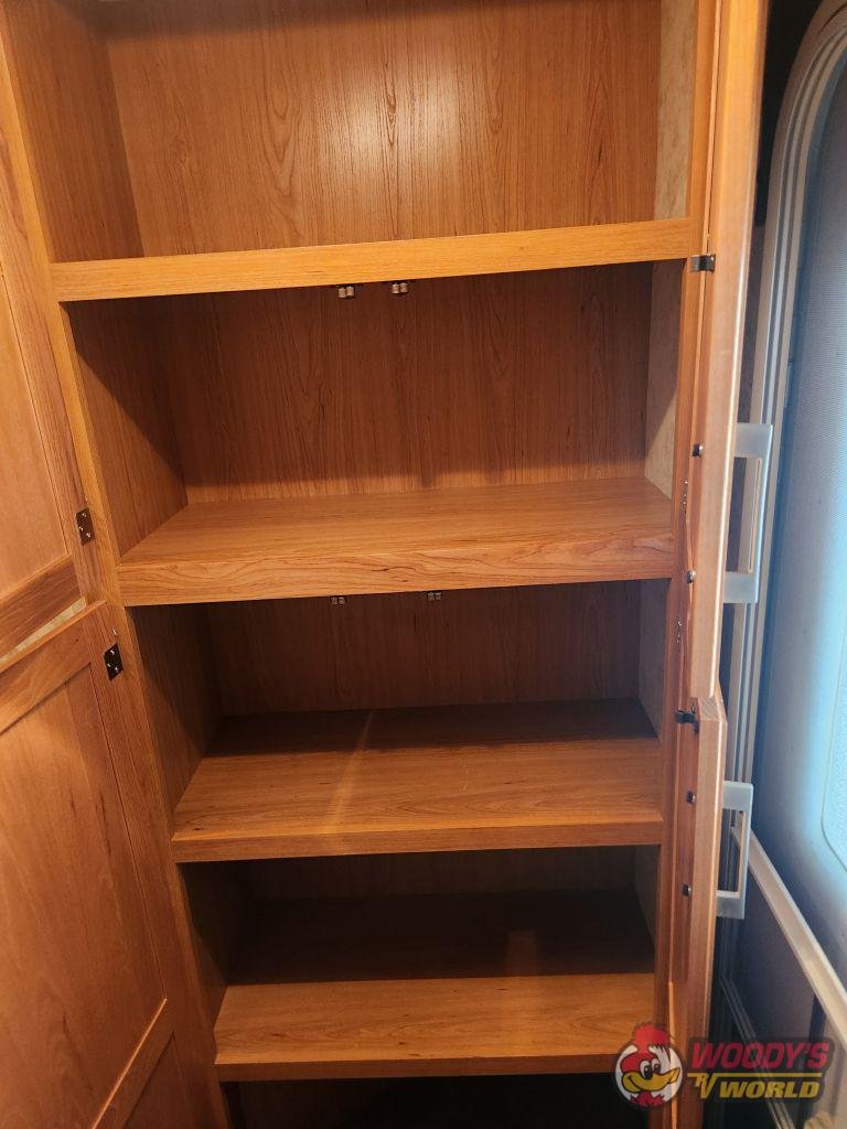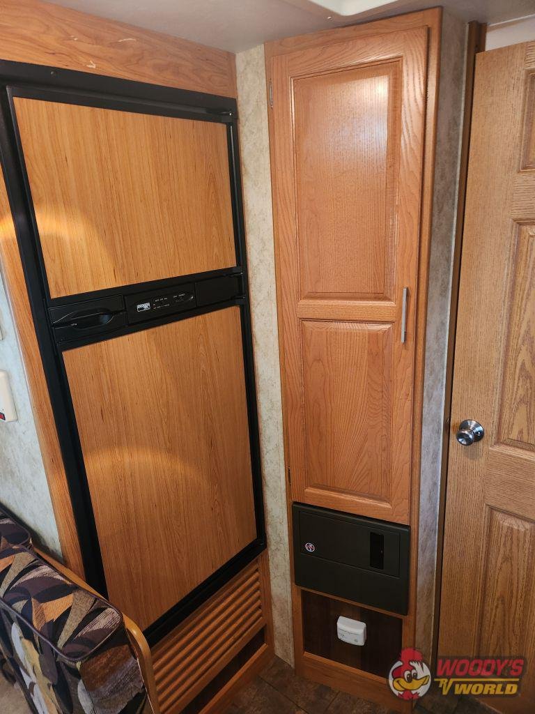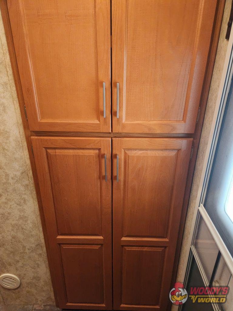 • Interior Features: 78-inch interior height; pillow-backed furniture; 13.5 ducted A/C; 30K BTU furnace; 6-gallon gas/electric water heater; DVD/CD/AM/FM stereo with iPod hookup; 19-inch LCD flat panel TV; oversized solid wood raised panel cabinet doors; night shades in living area; adjustable shelves in pantry.